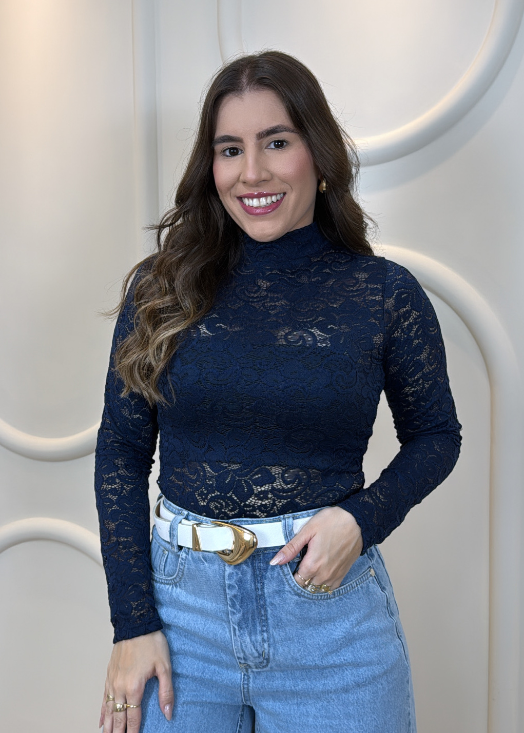Com um design sofisticado e atemporal, ele traz a delicadeza da renda combinada com a sensualidade na medida certa através da transparência nas mangas e no colo. A gola alta adiciona um toque refinado, perfeito para composições mais elegantes ou modernas.