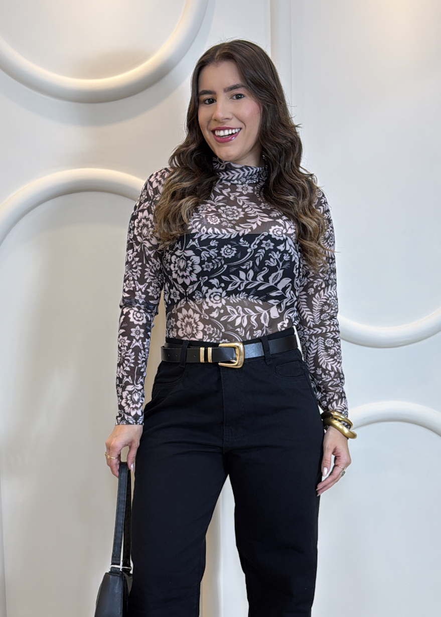 Body Feminino Tule Floral Manga Longa Gola Alta Segunda Pele - Elegância e Estilo Moderno
