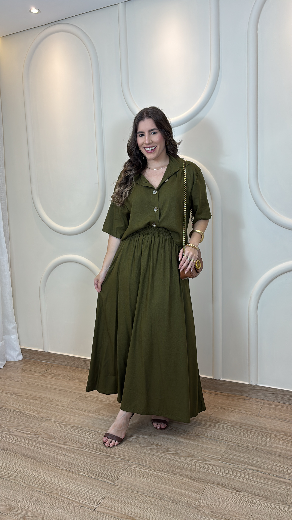 O tom terroso traz um ar moderno e atemporal, ideal para diversas ocasiões: desde um almoço especial até um evento mais arrumado. É aquele tipo de peça versátil que você usa uma vez e já entende por que virou queridinha de quem ama se vestir bem.