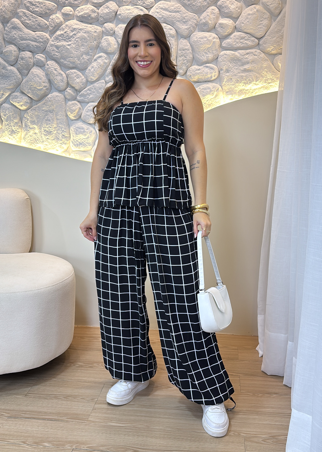Conjunto Feminino Xadrez Preto com Blusa de Alça e Calça Pantalona – Moderno e Confortável
