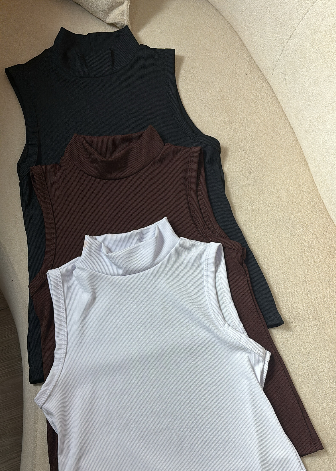 Sabe aquela peça curinga que combina com tudo e ainda valoriza o corpo? Essa regata canelada com gola alta é exatamente isso.