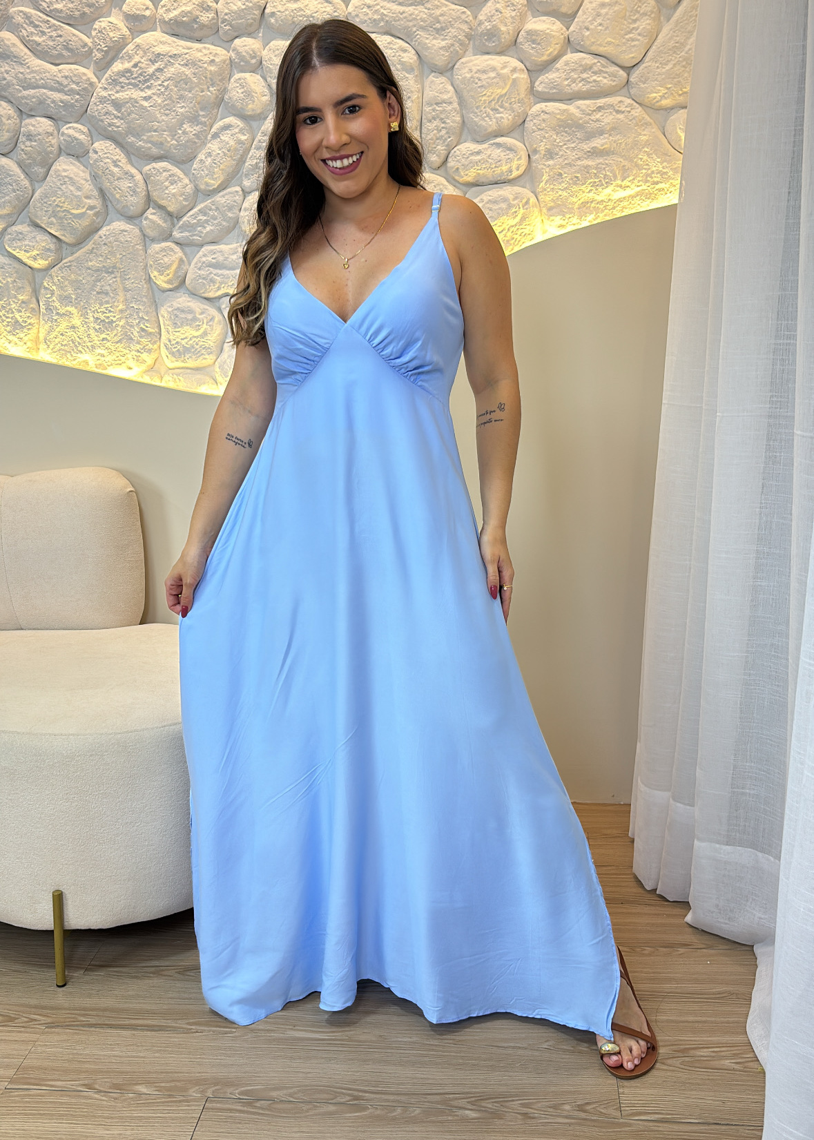 Código: Vestido-Longo-Feminino-de-Viscose-Liso-Azul-Bebe-com-Decote-V-e-Alcas-Finas-Leve-e-Elegante