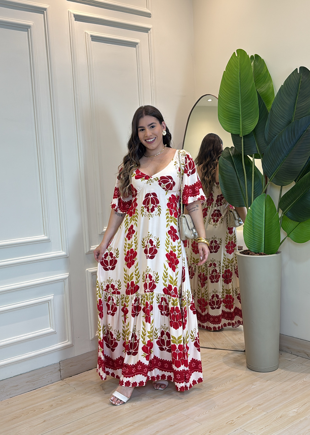 Vestido Longo Feminino em Viscolinho Floral Vermelho com Elástico nas Costas – Leve e Confortável