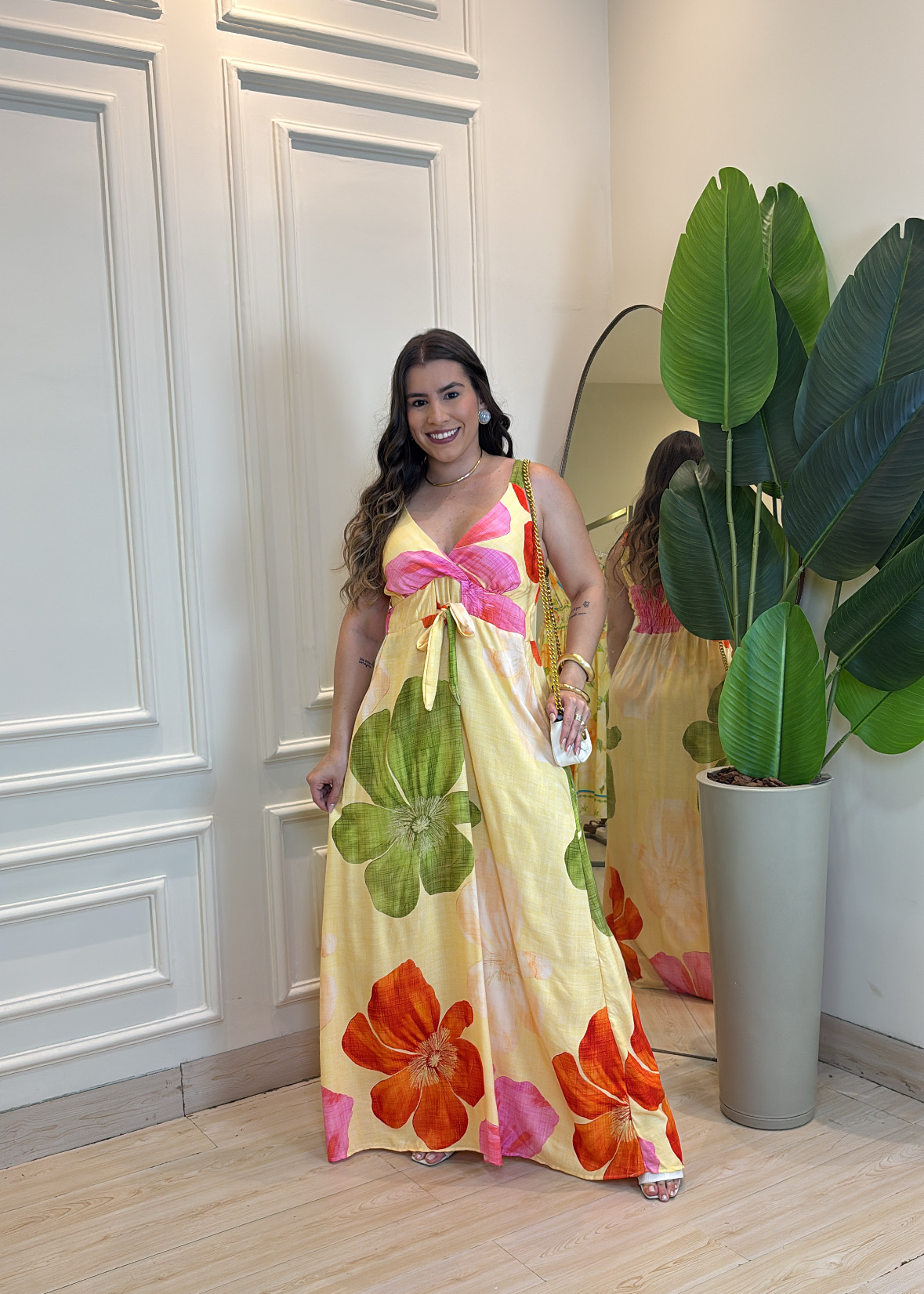 Vestido Longo Viscolinho Floral Amarelo com – Caimento Leve, Cores Vibrantes e Conforto Absoluto