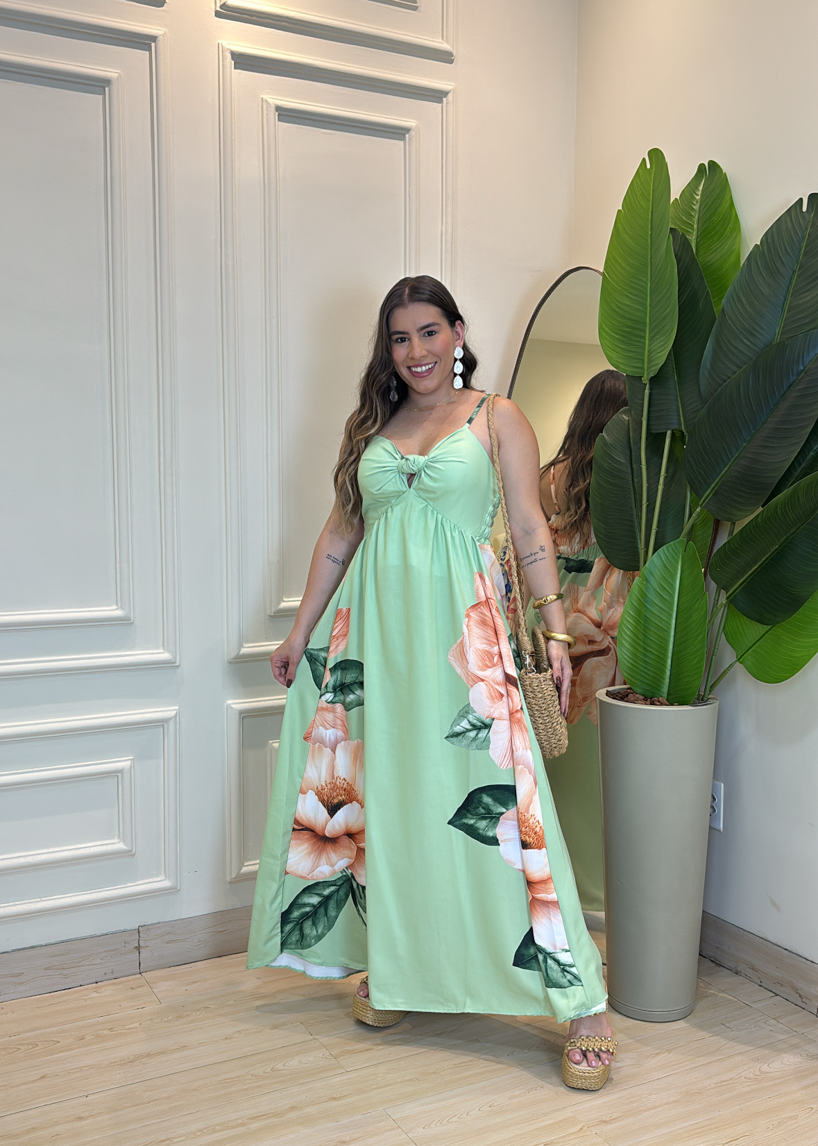 Vestido Midi Feminino em Crepe com Nó Frontal e Amarração – Estampa Floral Verde