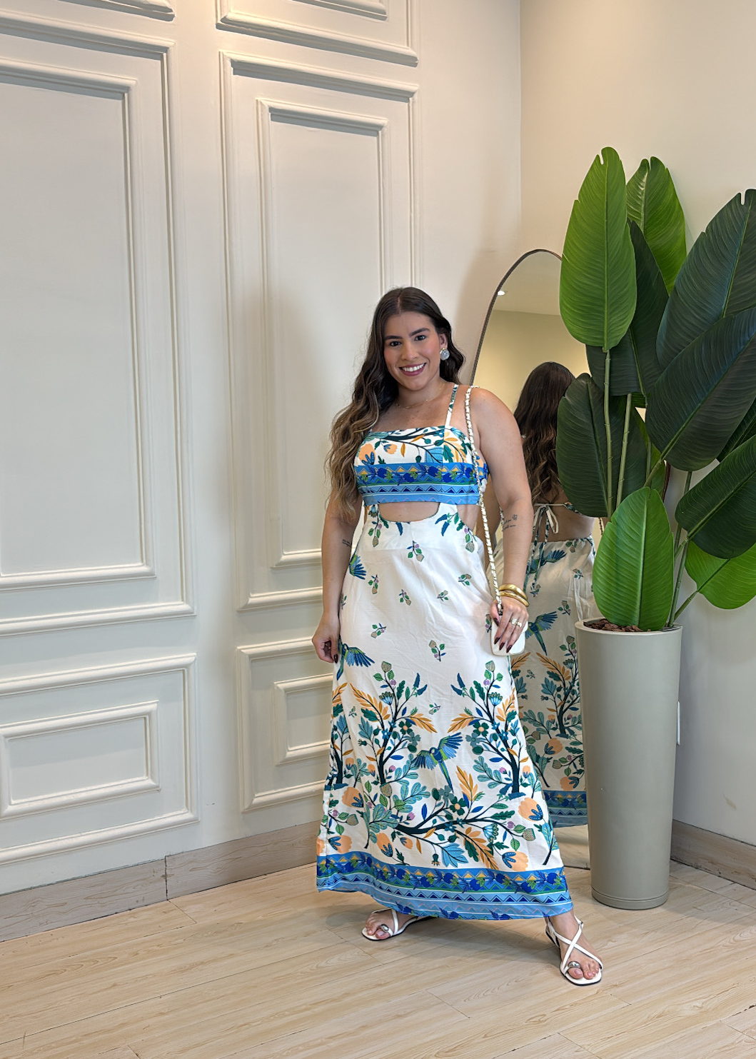 Seu design traz um recorte estratégico na cintura, que valoriza a silhueta de forma moderna e feminina, enquanto a amarração ajustável nas costas garante um caimento perfeito para diferentes corpos. A estampa exclusiva, inspirada em elementos florais e artesanais, eleva o visual e transforma o look em uma escolha certeira para ocasiões especiais ou momentos de lazer com estilo.