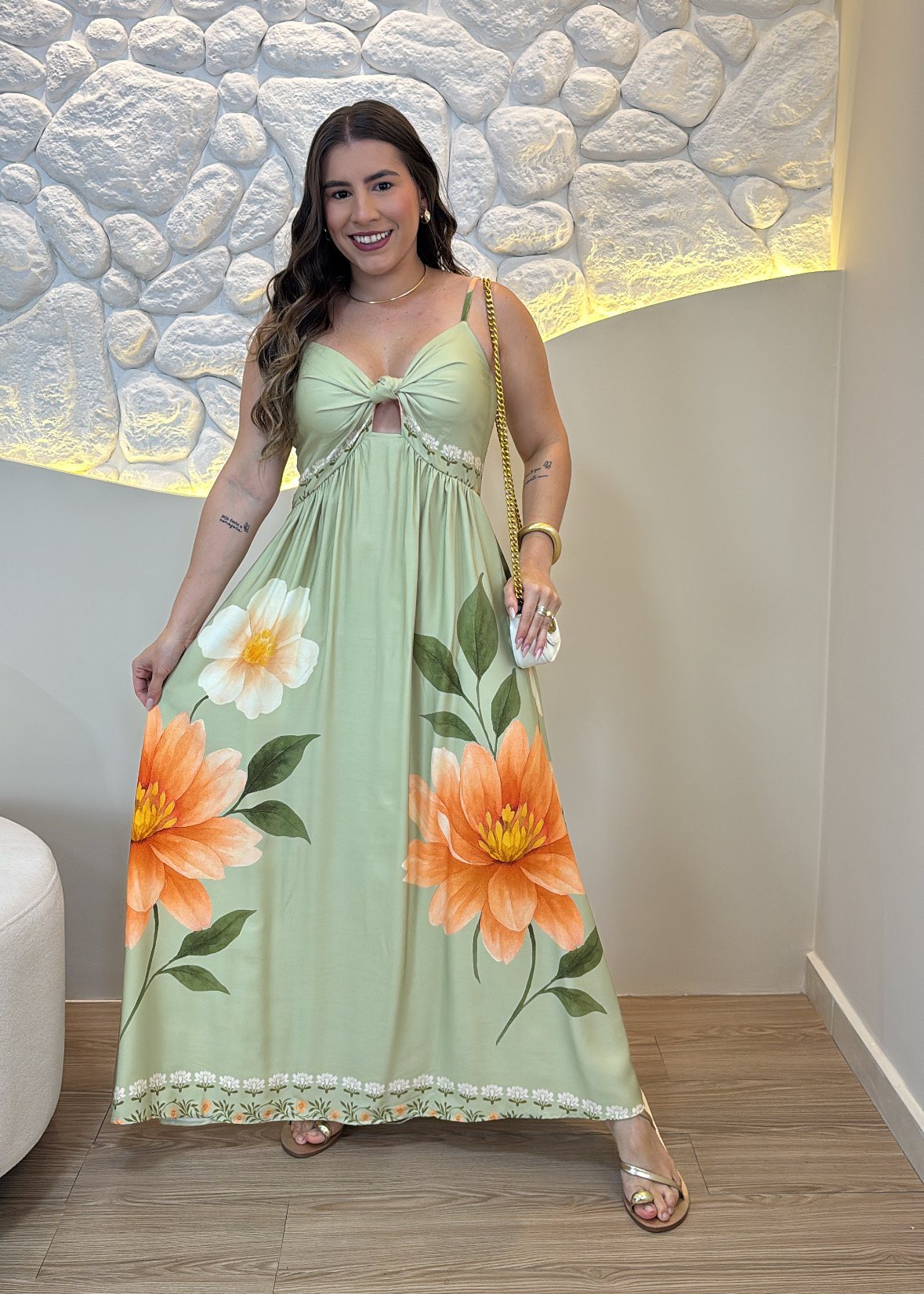 Vestido Midi Feminino Viscolinho Verde Floral com Nó Frontal e Alças Reguláveis