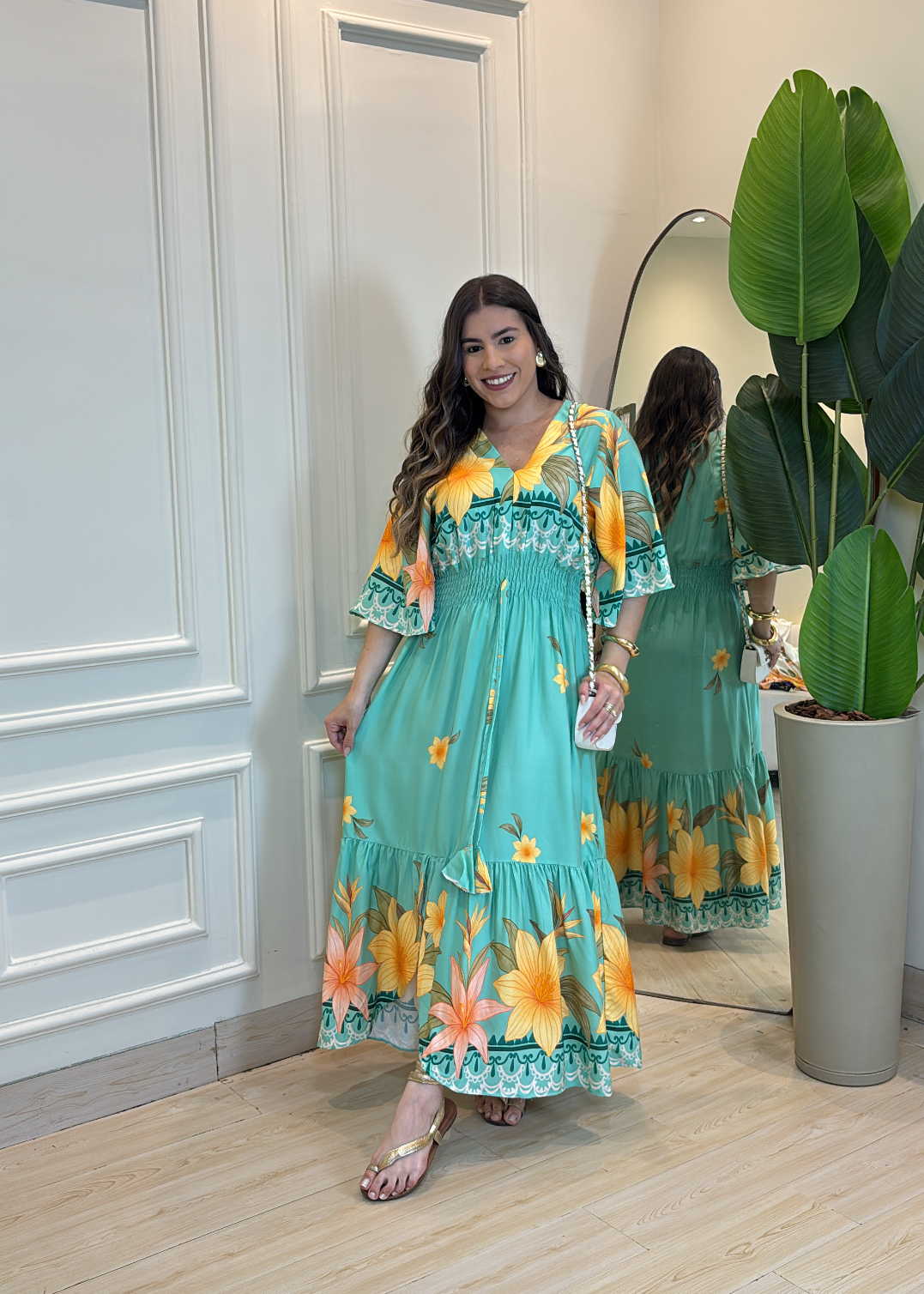 Imagine-se vestindo uma peça leve, fluida e cheia de charme, perfeita para acompanhar seus dias mais ensolarados. O Vestido Longo Floral em Viscolinho foi criado para quem busca conforto sem abrir mão do estilo. Sua estampa floral tropical transmite frescor e alegria, enquanto o decote em V valoriza o colo de forma elegante e feminina.