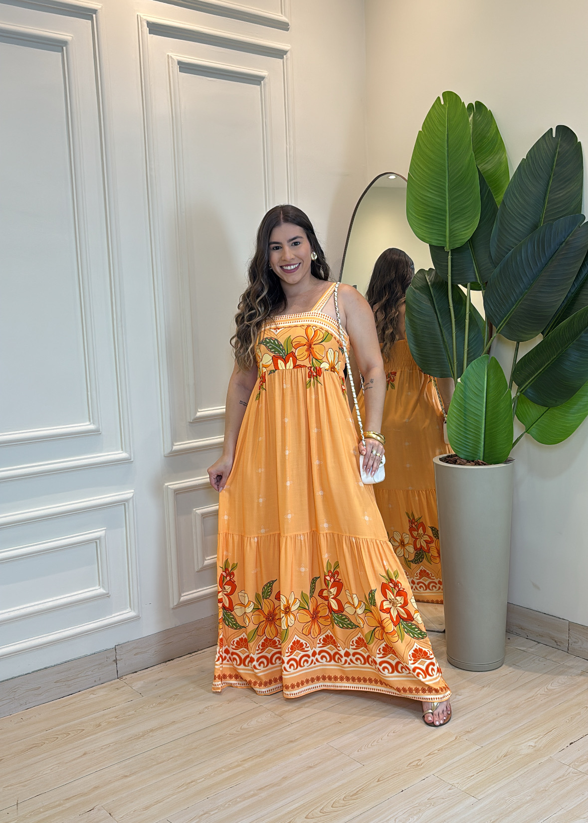 O Vestido Midi Viscolinho Estampa Fundo Laranja é aquele modelo que conquista à primeira vista: fresco, confortável e com um caimento impecável que combina perfeitamente com dias quentes, passeios, viagens ou aquele look chic e descomplicado.